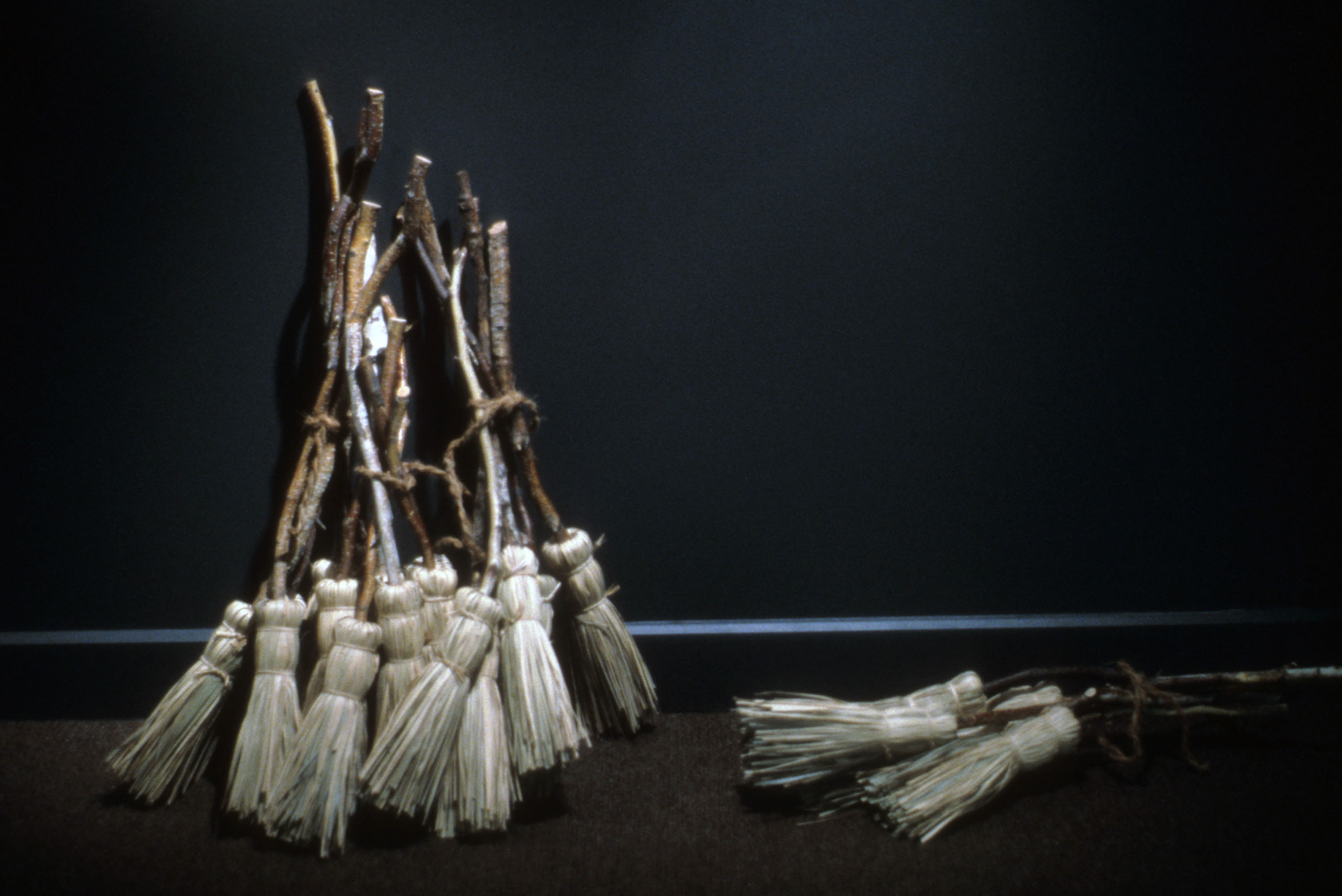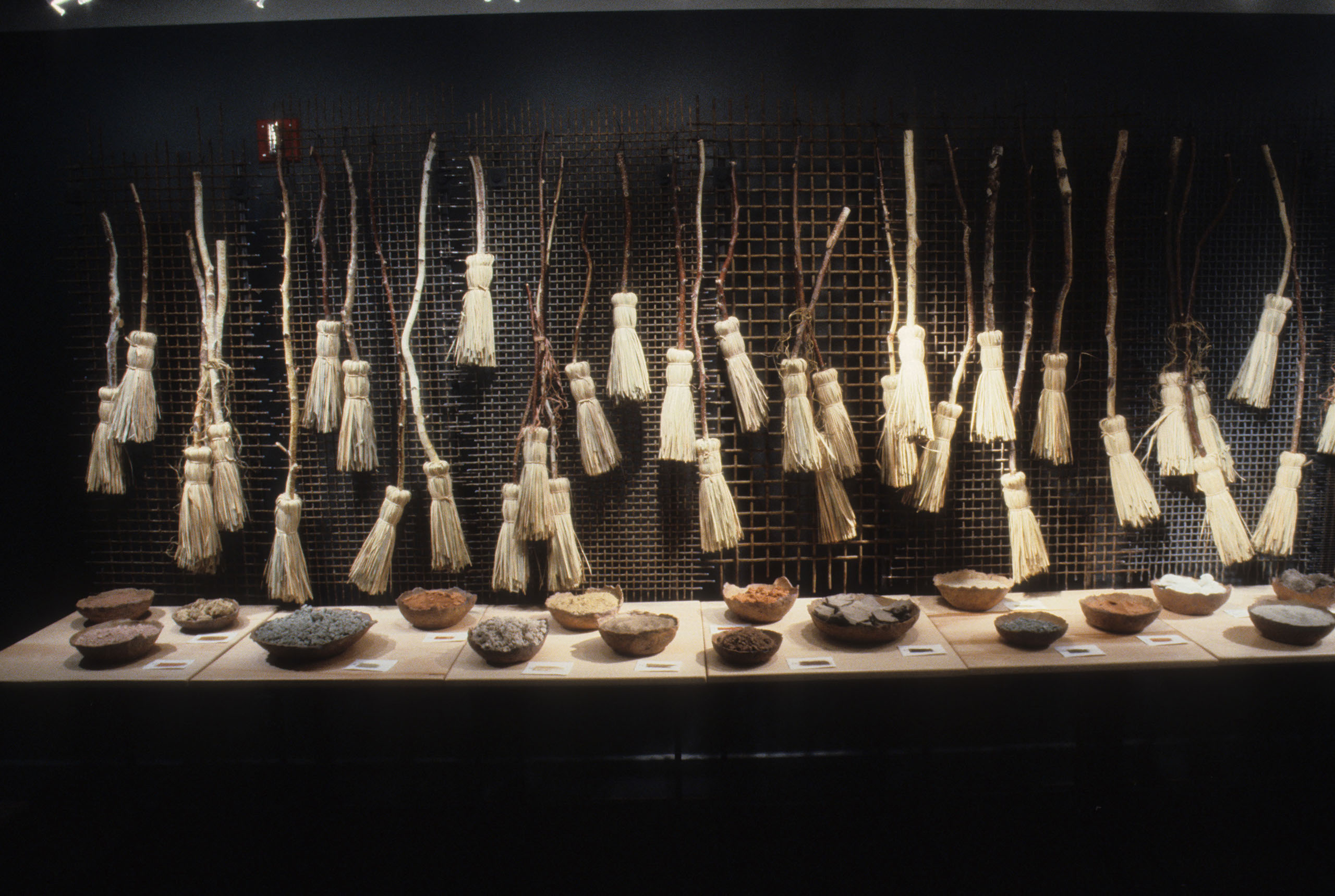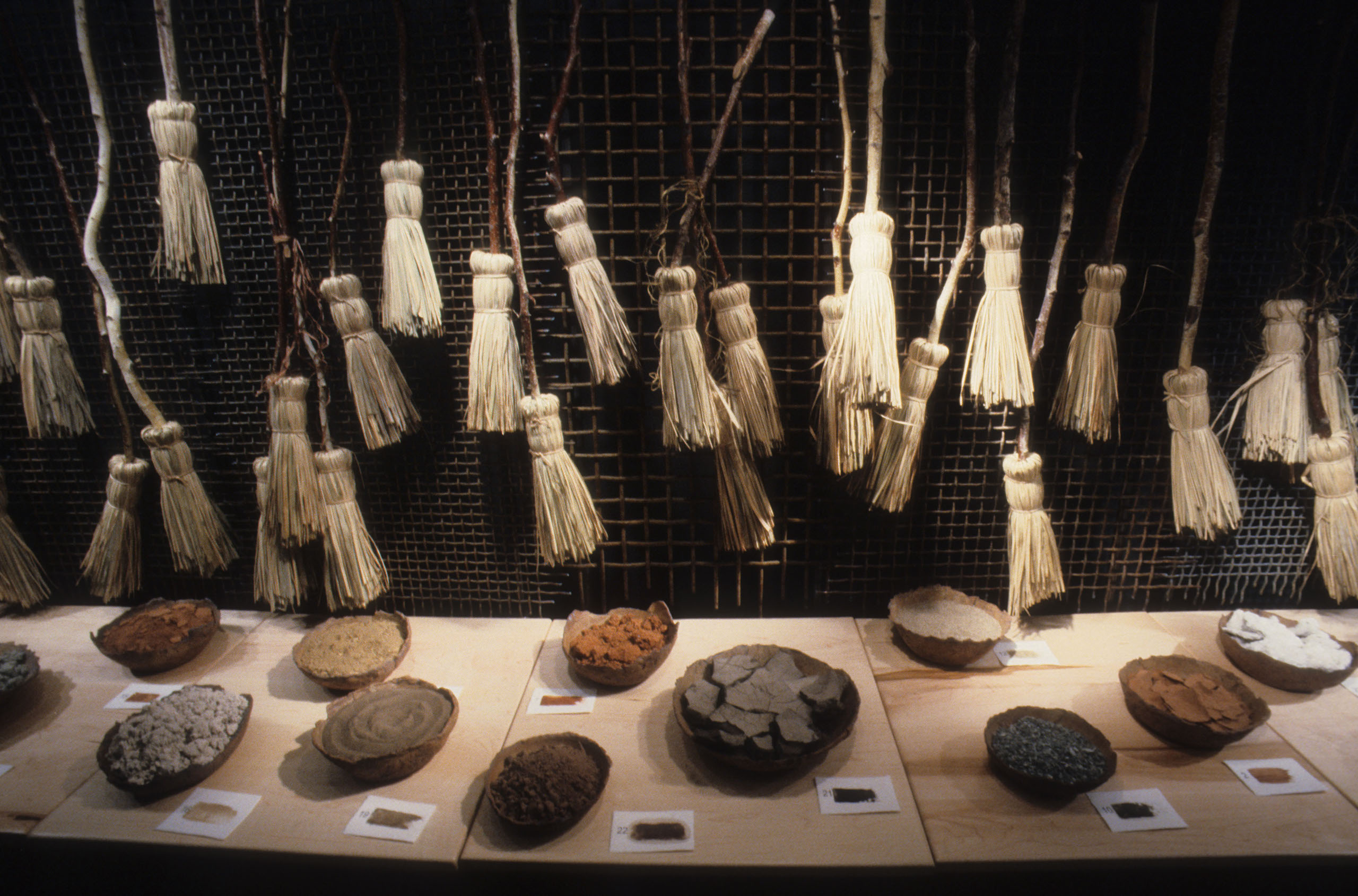 As I looked at a photograph of a Brazilian woman making natural fiber hand dusters, I was struck with the universality of eliminating dirt from our homes. At the same time I was intrigued by the irony of our fight against dirt because the earth’s soil provides for our sustenance. Matter Out of Place is a portrayal of that irony. The installation consists of 100 hand made brooms, a collection of 27 bowls of dirt of varying color and texture, documentation about the gathering of each dirt sample, three lithographs, and a poem by Emily Dickinson.