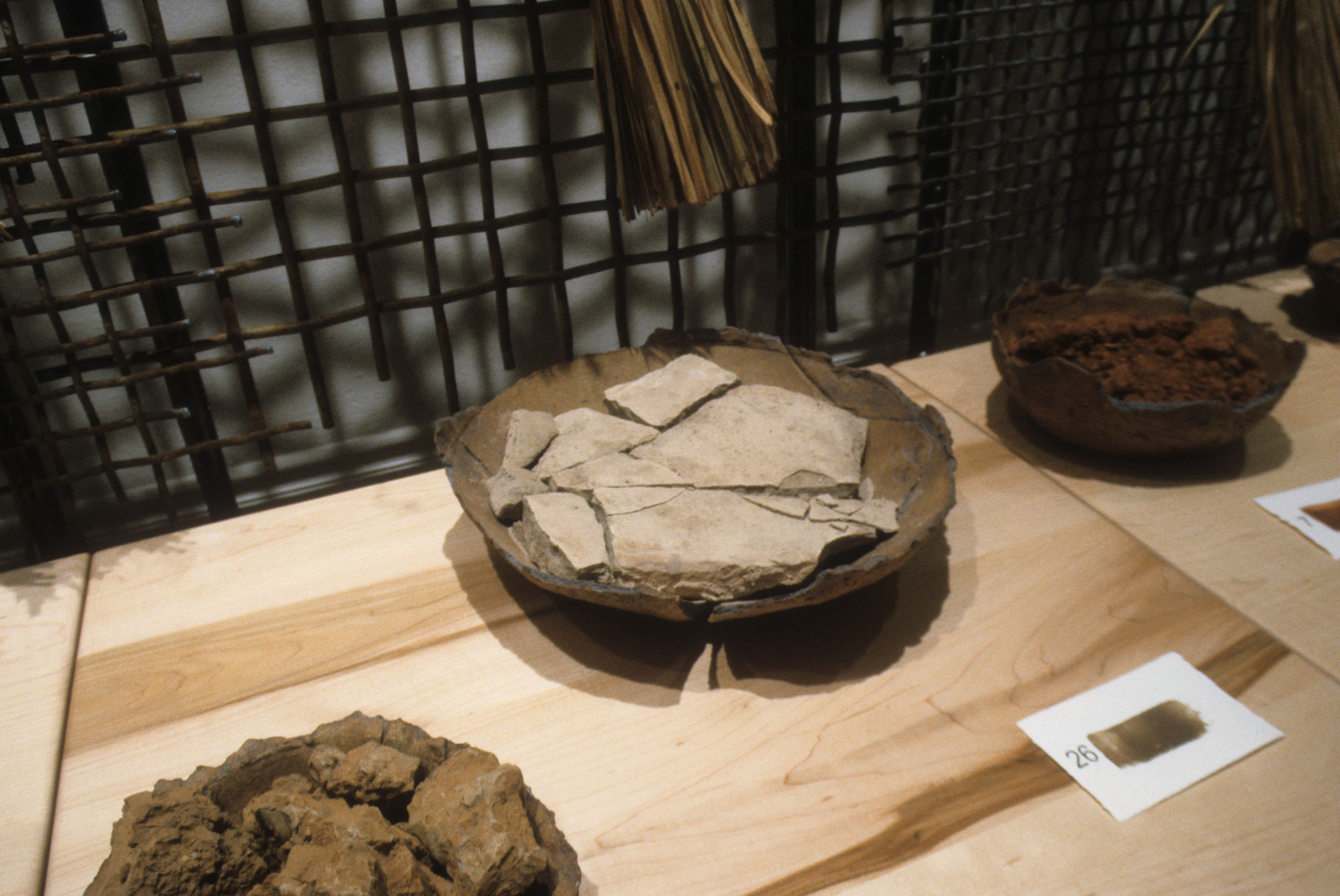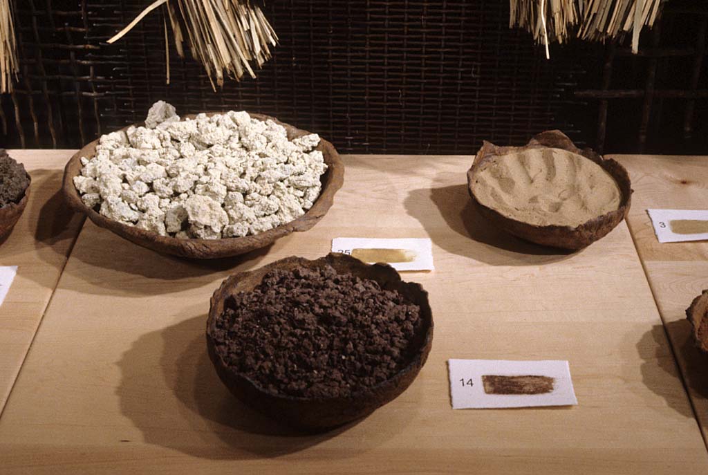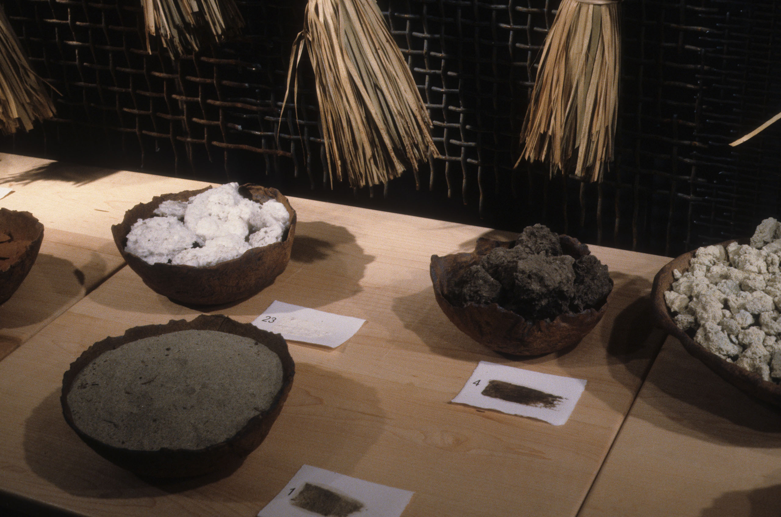 As I looked at a photograph of a Brazilian woman making natural fiber hand dusters, I was struck with the universality of eliminating dirt from our homes. At the same time I was intrigued by the irony of our fight against dirt because the earth’s soil provides for our sustenance. Matter Out of Place is a portrayal of that irony. The installation consists of 100 hand made brooms, a collection of 27 bowls of dirt of varying color and texture, documentation about the gathering of each dirt sample, three lithographs, and a poem by Emily Dickinson.