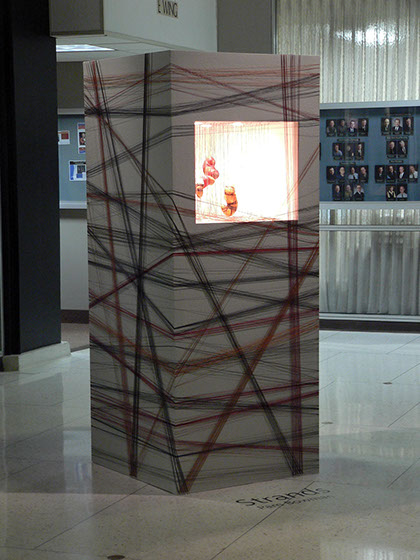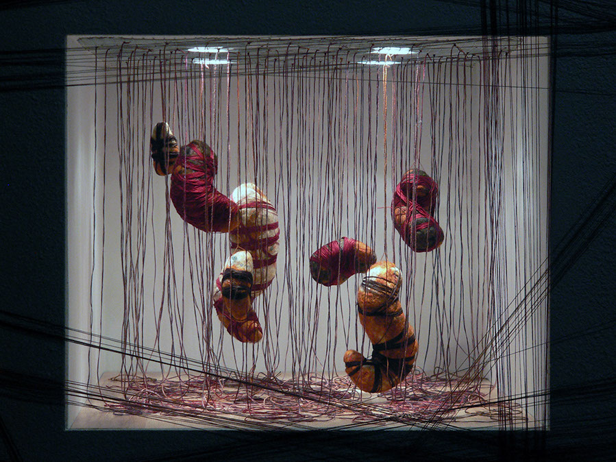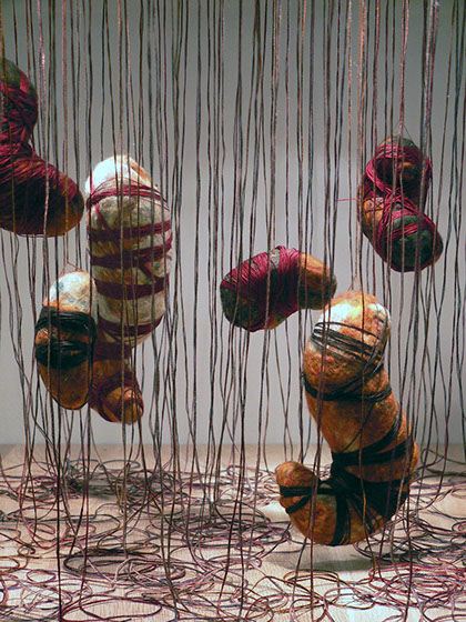 Many of the processes I use relate to traditional fiber techniques, reminiscent of ancient repetitive work necessary for home and life. In this work, Strands references weaving, felting, and the wrapping of skeins of yarn into balls in preparation for knitting, crocheting or weaving. The materials used in Strands (wool, cotton and soap) allude to the materials used by women throughout time. The forms are purposely organic and cocoon-like.